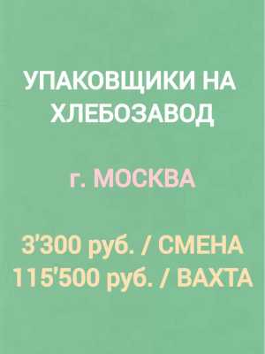 На хлебозавод в г. Москва требуются упаковщики Вахта 35 или 45 смен на выбор, график 6/1 по 11 часов, дневные и ночные...