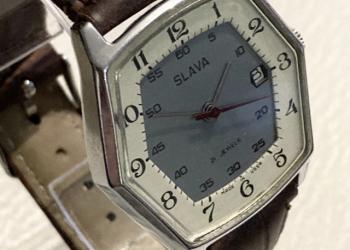 Редкая Слава с граненым стеклом. Двойной календарь, накладные метки. Часы на ходу, состояние на фото, всё работает.