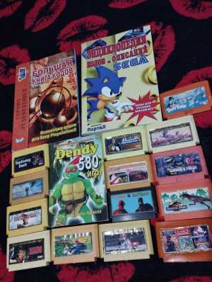 Много разных картриджей и книг паролей игр