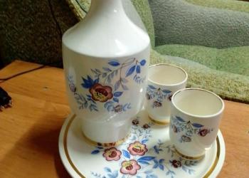 Набор:Штоф, Графин, 2 стакана, блюдце (Голубые цветы)Конаково Зик.Красивый редкий набор,позолото.