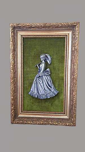 Винтаж. Декоративное панно в виде объемной фигурки девушки из олова на бархате оливкового цвета.