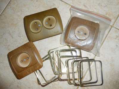 Новые. Цена за всё. Рамки 10 шт (золото). Настенные рамки для выключателей. Настенные 6,5 х 6,5. Розетки новые (3 шт.).