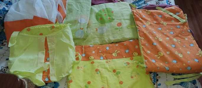 Бортики в хорошем состоянии. Есть наволочка, простынь на резинке,карман боковой, сами бортики на четыре стороны.
