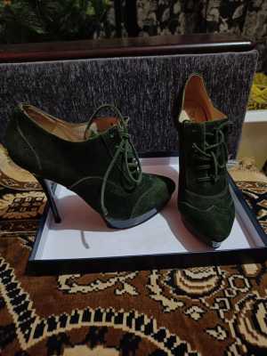 Ботильоны Braska из натуральных материалов сверху и внутри, темно-зеленые, новые. Высота каблука 12см, высота танкетки 2см.