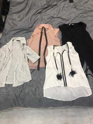 Розовая блузка 600; белая блузка 500; черная жилетка 800; белая рубашка в черную полоску 500