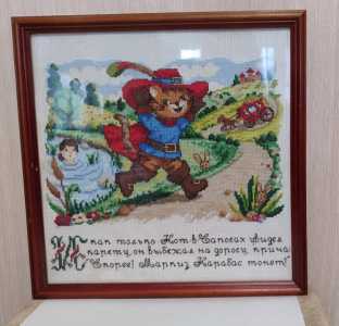 -"Кот в сапогах" вышивка крестиком ручная работа. Деревянная рамка со стеклом. Размер 32,5×33см.