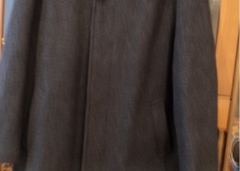 Пальто зимне-осеннее модное темно-серого цвета из натуральной ткани с меховым воротником и карманами.