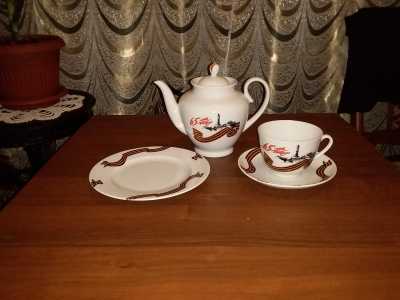 Продается чайный сервиз фарфоровый "65 лет Победы" 70-годы Чайник заварной. Высота 18 см. Мелкая тарелка.
