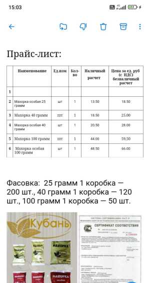 просьба сначала написать Махорка фасованная 40 г 26 руб и 28 руб фасовка 100 г 60 руб за пачку плюс цена доставки до вашей...