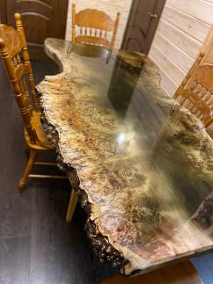 Этот большой обеденный или офисный стол из слэба капового тополя изготовлен и выставлен на продажу.