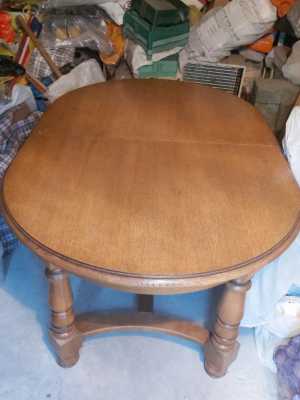 Старый , крепкий стол под реставрацию . Со столешницы лак снят .Мех-зм раскладывания на тросиках ( нужен ремонт ).