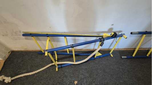 Металлическая лестница. Синяя с жёлтым. Встаёт в распор к потолку 2.5м. С канатом.