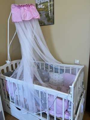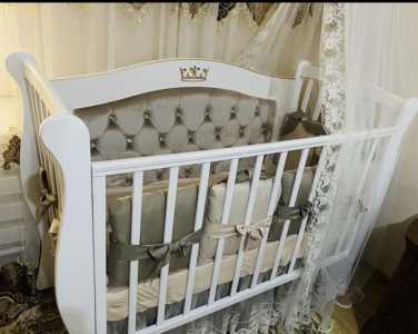 Продам кроватку для малыша с двумя видами бортов, одни потоньше вторые, в виде подушек очень мягкие и классные.