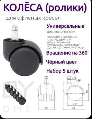 Колеса (ролики) для кресла, комплект 5 шт, диаметр 50мм, нагрузка до 150 кг, черные цена 350 руб за пять штук.