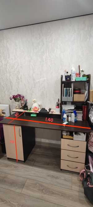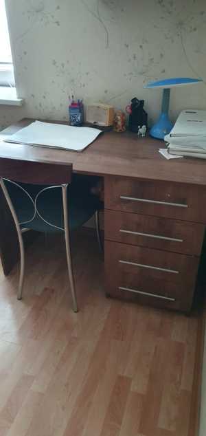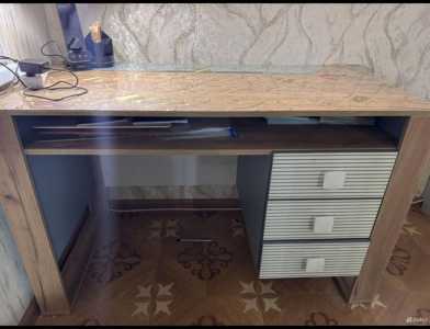 Продам стол в хорошем состоянии, в столе есть 2 закрытых полки, 3 выдвижных ящика и 4 открытых полочки.