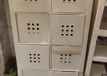 Новый стеллаж для обуви и вещей. При транспортировке кое где потерся немного, но не критично. Размеры не знаю.