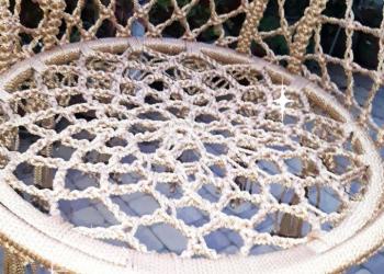 Подвесное кресло-шатёр, выполнено в технике макраме из полиэфирного шнура. Диаметр сиденья 100-110см.