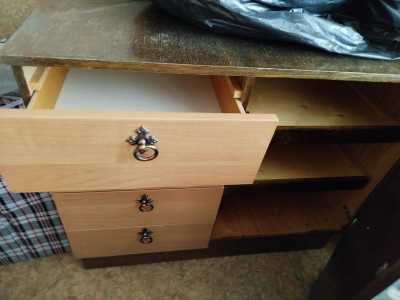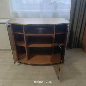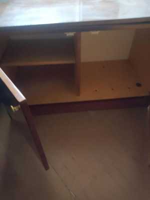 Отлаю бесплатно тумбу б/у в хорошем состоянии. Справа полки, слева ящики. Фасад-темный и светлый лак.