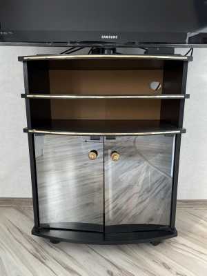 Продаётся стильная чёрная тумба под телевизор с элегантными золотыми акцентами на дверцах и зеркальными дверцами.
