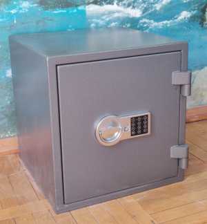 Огневзломостойкий сейф с электронным кодовым замком. Внешние размеры: высота 46 см, ширина 44 см, глубина 44 см.
