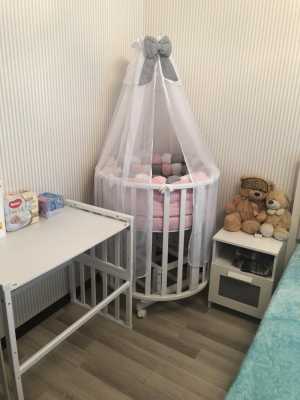 Продаю детскую кроватку трансформер с маятником,балдахином и 2-мя матрасами, есть наматрасник овальный,простынь круглая,все...