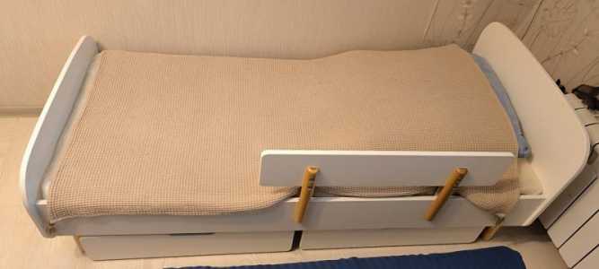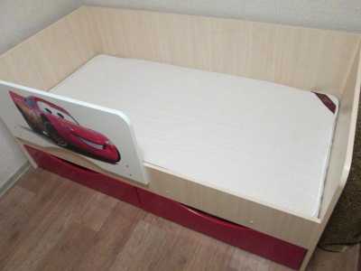 Детская кровать для детей. В комплекте съёмный бортик, двусторонний матрас, два ящика. Общий размер кровати 165*75 см.
