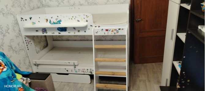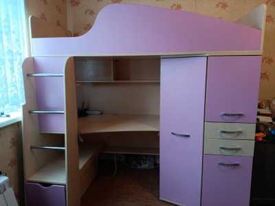 Кровать-чердак со столом и шкафом, удобное рабочее место, полки, ящики под книги, игрушки. Ширина 152 см. Высота 201 см.