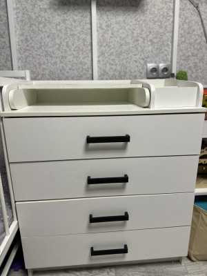 Комод с пеленальной доской выполнены из материала ЛДСП. Комод имеет 4 ящика и удобные органайзеры сверху .