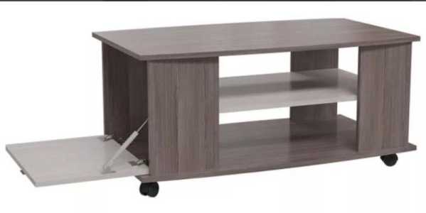 У журнального стола имеется мини-бар. Стол оснащен колесиками для удобного перемещения, двумя полками.