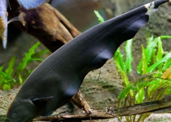 Аптеронотус белокаймовый, черный нож (Apteronotus albifrons) размеры от 9см Черный нож совместим с любыми мирными рыбками.