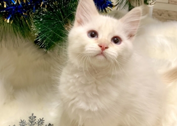 Белый котик с розовыми ушками породы Невская маскарадная (или Сибирский Колор - поинт). Котик родился 04.02.2018 года.