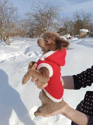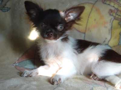Щенок Чихуахуа мальчик возраст 3,5 мес. ПРОДАН окрас- шоколадный с белым . длинношерстный.