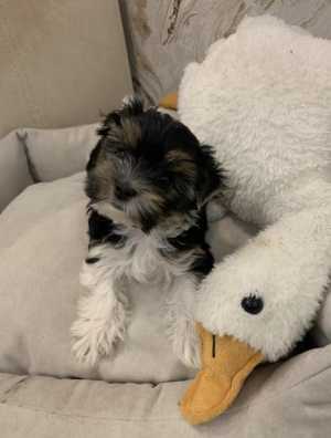 Готов к переезду щенок бивер-йоркширского терьера: окрас биро(бело-шоколадный). Шоколад на голове, спине; живот и лапы белые.