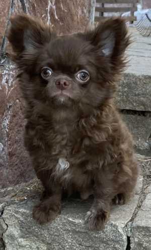 Чихуахуа девочка Ириска 🌺 Др 13.08.25 Длинношерстная Привита Вес 1 кг 900 грамм Окрас шоколад с белым.
